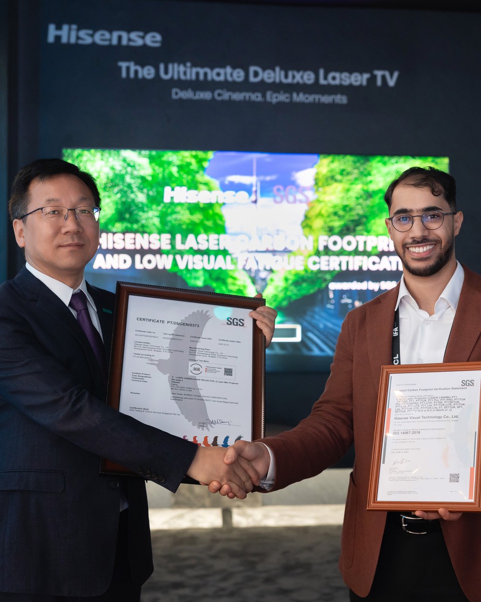 O Hisense PT1 é também o primeiro projetor a obter a Certificação SGS de Pegada de Carbono, reduzindo as emissões em 56% face à geração anterior — de mais de 2.400 kg de CO₂ para cerca de 1.080 kg. Além disso, a fonte de luz laser consome menos energia e dura até 25.000 horas — mais de 10 anos de utilização regular.