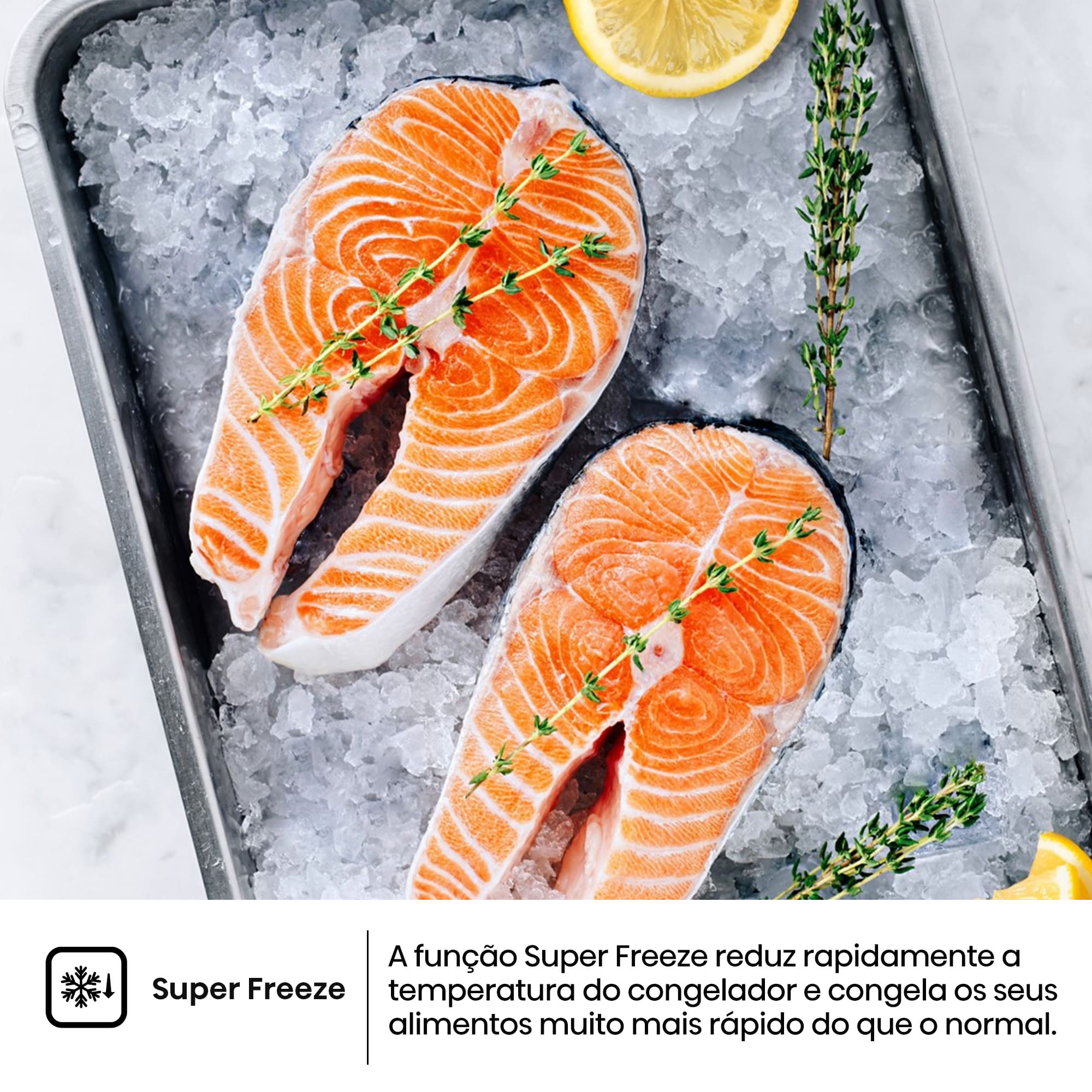 A função Super Freeze reduz rapidamente a temperatura do congelador e congela os seus alimentos muito mais rápido do que o normal.