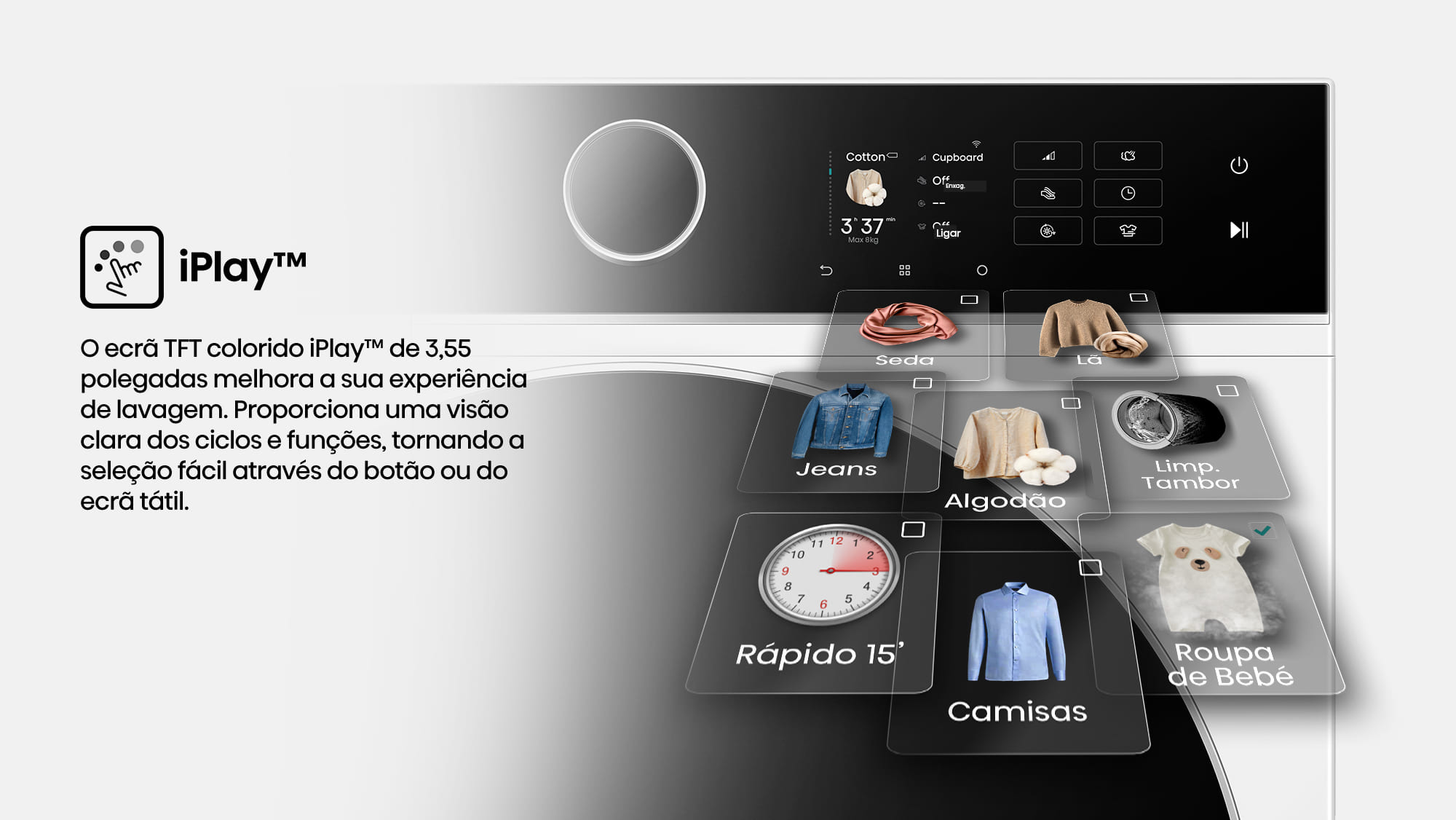 O ecrã TFT colorido iPlay™ de 3,55 polegadas melhora a sua experiência de lavagem. Proporciona uma visão clara dos ciclos e funções, tornando a seleção fácil através do botão ou do ecrã tátil.