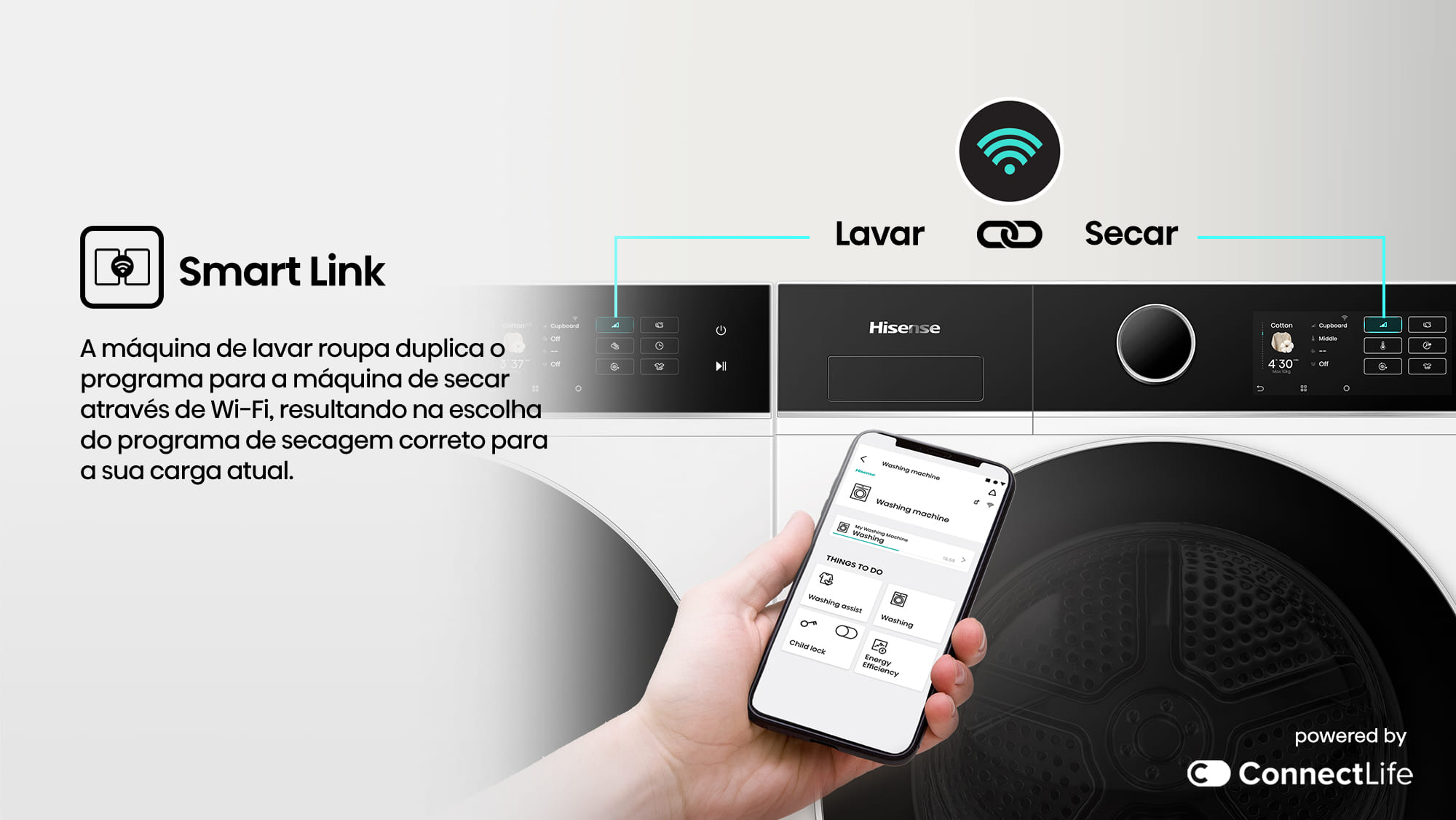 A máquina de lavar roupa duplica o programa para a máquina de secar através de Wi-Fi, resultando na escolha do programa de secagem correto para a sua carga atual.