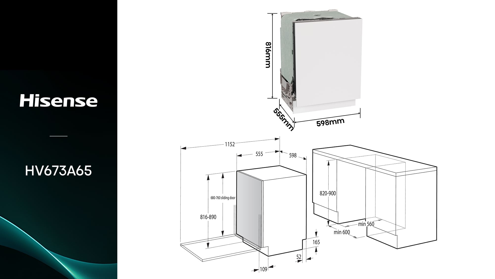Hisense - HV673A65 – Máquina de Lavar Loiça Encastre 16 conjuntos, Classe A, ,