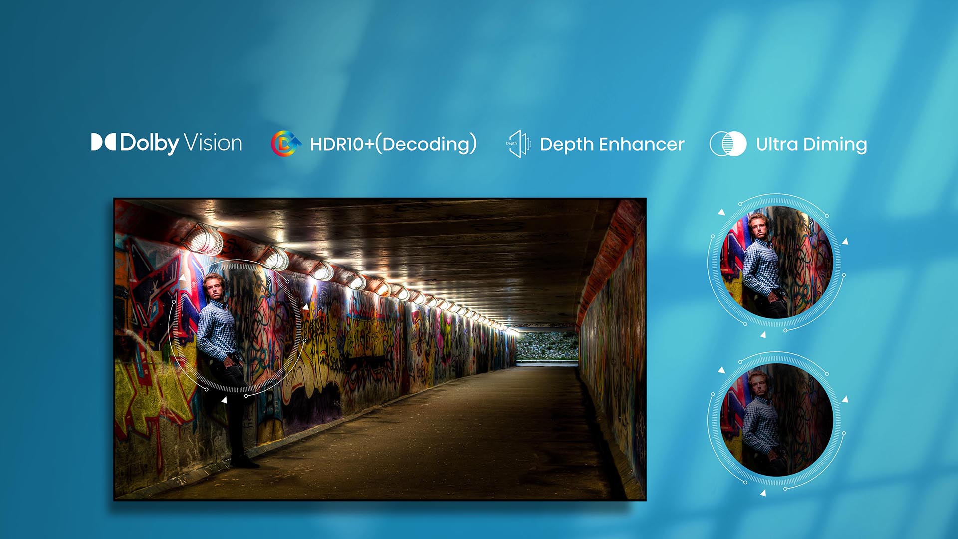 O ângulo de visão Ultra, permite uma experiência de visualização imersiva de qualquer ângulo do seu sofá. A qualidade de imagem é adaptada a todos os ângulos de visualização para que se sinta sempre no centro da ação.