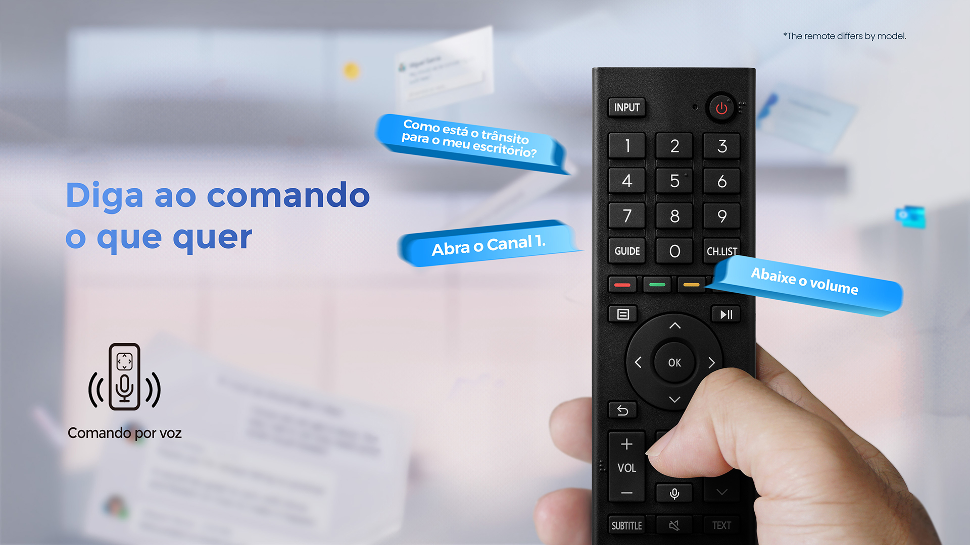 Pode controlar a televisão com voz através do comando à distância sem quaisquer configurações nem menus complicados. Ao premir o botão do microfone no comando à distância, pode dizer o que quiser, a televisão pode responder rapidamente. Ligar o Canal 1. Baixar o volume. Como está o trânsito para o meu escritório? Tenho alguma reunião entre as 14h e as 15h?